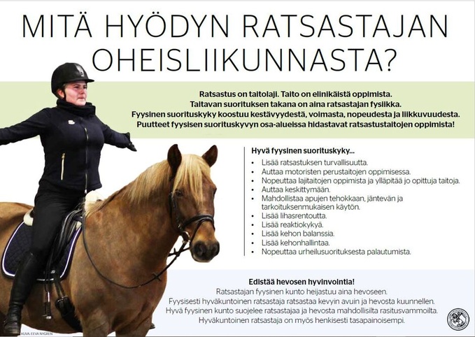 Lisää ratsastuksesta liikuntamuotona löydät SRL:n Ratsastuksen lajianalyysistä. Tutustu myös ratsastuksen terveysprofiiliin.